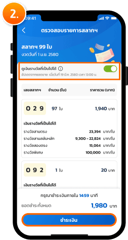 ตรวจสอบรายการสลากฯ โดยสามารถกดดูเงินรางวัล ที่เป็นไปได้ของเลขสลากฯ ที่ซื้อ ณ เวลาที่มีการอัปเดต ยอดขายล่าสุดได้ และ กด “ชำระเงิน”